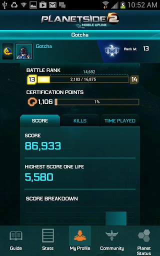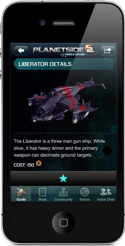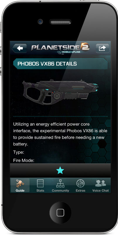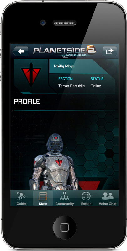 Les amateurs de jeux peuvent également accéder aux profils de personnage avec les rangs de bataille et les points de certification. Des armes de pointe et véhicules aux statistiques globales et classes et des informations détaillées sont disponibles et peuvent être partagées via les médias sociaux. Les utilisateurs peuvent également accéder à des vidéos de PlanetSide 2, télécharger des fonds d’écran, et se connecter aux pages Twitter et Facebook officielles du jeu.