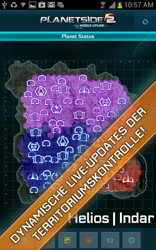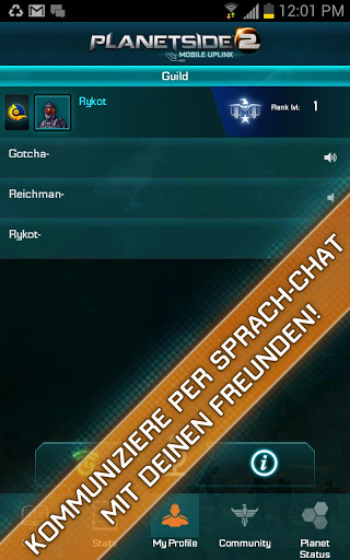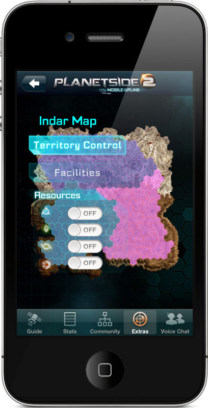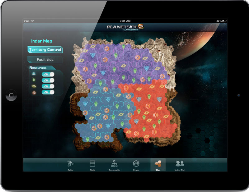 La fonctionnalité de chat vocal in-app permet aux joueurs de discuter avec d’autres joueurs et des membres de leur groupe directement depuis un iPad ou un iPhone. Les caractéristiques les plus impressionnantes de l’application sont une carte interactive et le chat vocal. Pour les joueurs connectés au serveur, la carte interactive dans le jeu affichera le contrôle du territoire, les ressources et les installations. La carte est mise à jour quasiment en temps réel et constitue un excellent complément à l’expérience de jeu, car les utilisateurs peuvent visualiser l’action sur leur appareil mobile tout en jouant à PlanetSide 2.