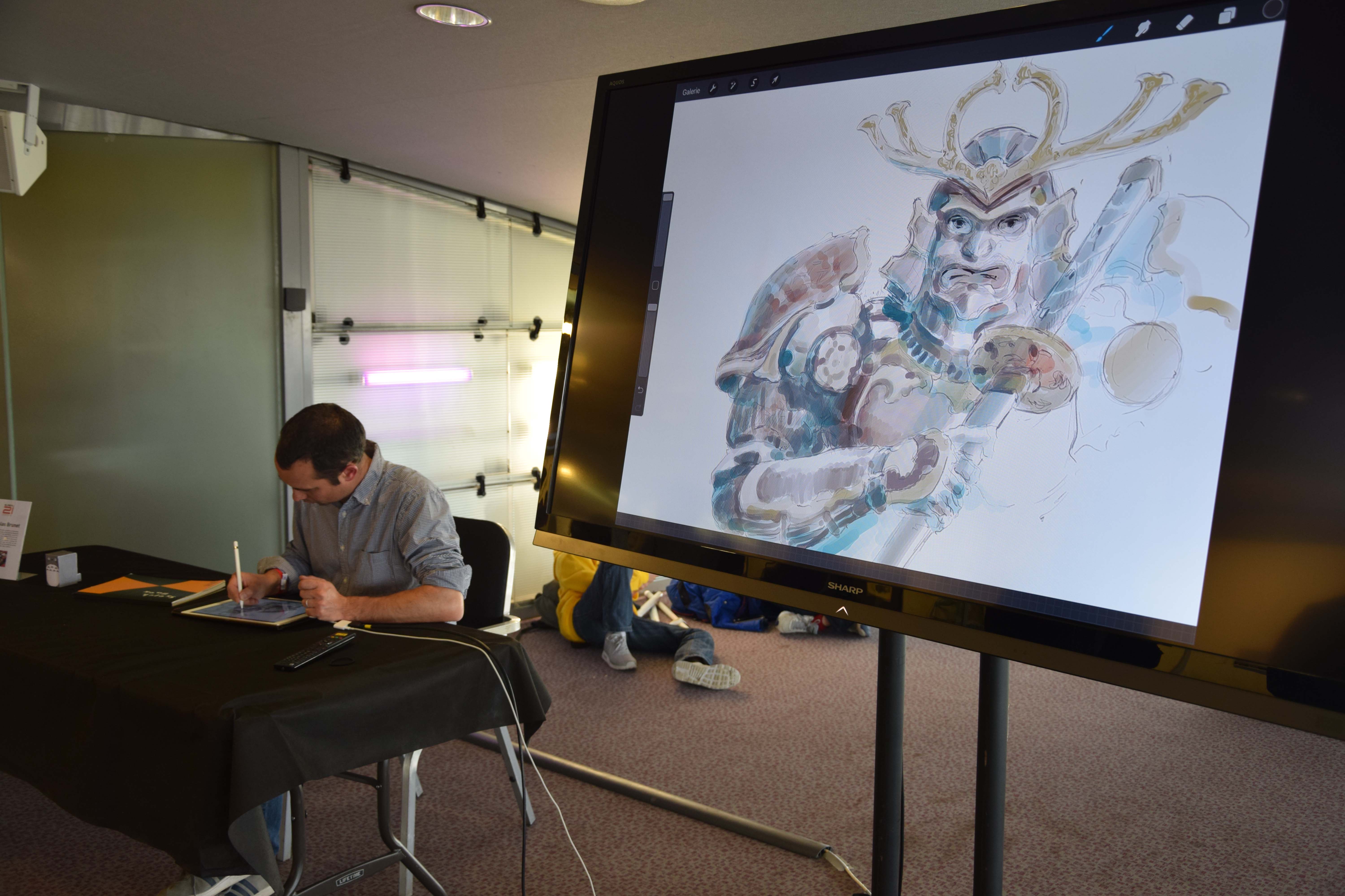 Les artistes étaient au +2 et c’est là que j’ai pu retrouver mon ami Asroth venu pour présenter ses FanArts et faire des dessins à la demande. Il était également là en tant que directeur artistique du projet “Ulysse 31 by Parallax” qui a donné lieu à un concert exclusif avec David Colin.