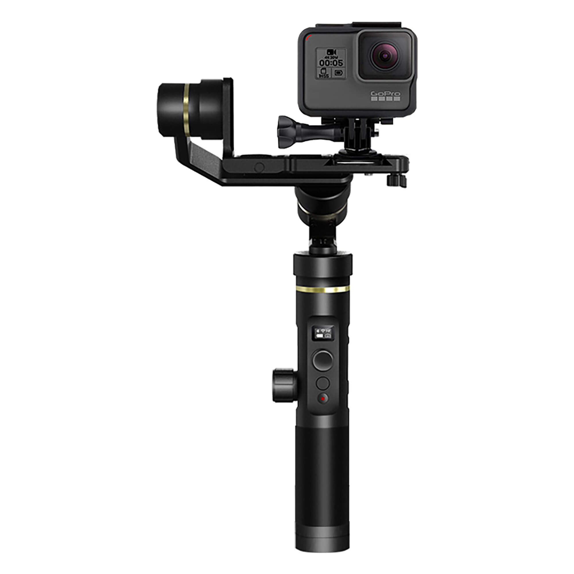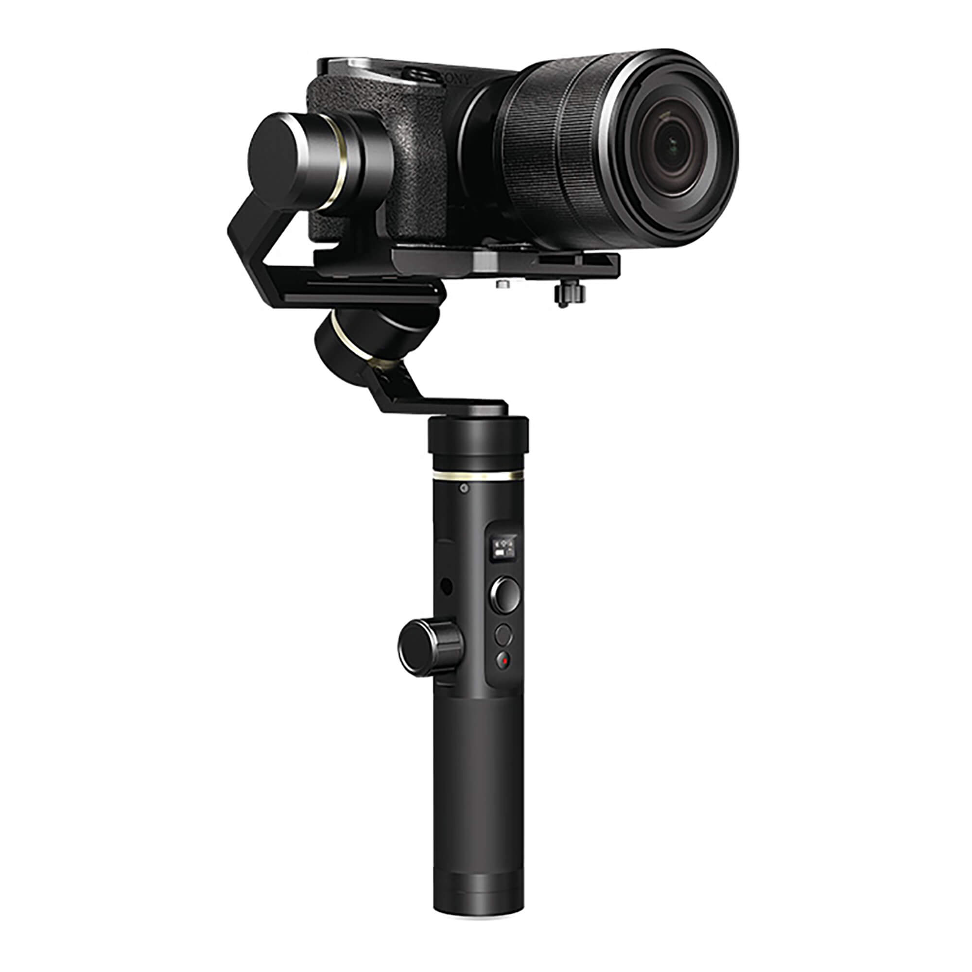 Le manche du G6 Plus est équipé de quatre éléments de contrôle afin d’accéder avec une seule main aux fonctionnalités du stabilisateur.