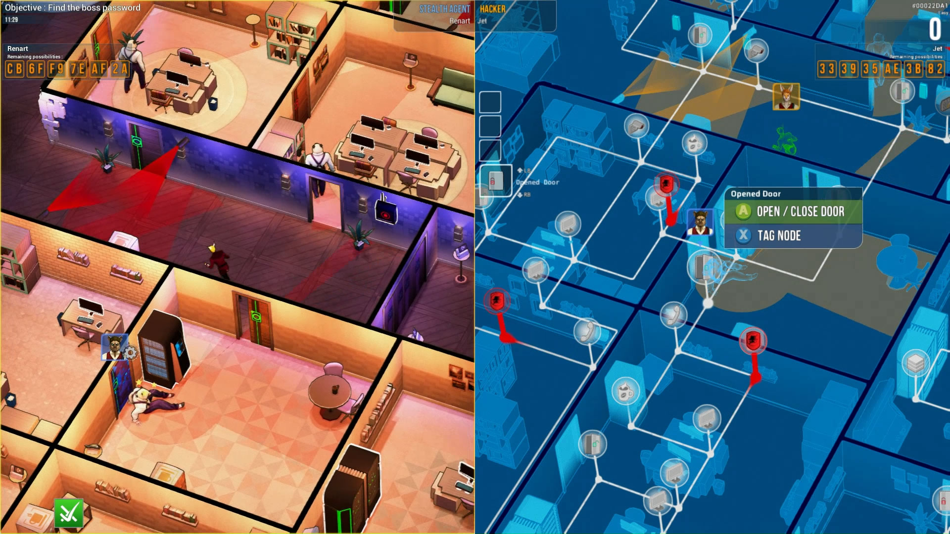Hacktag est un jeu d’infiltration arcade et nerveux avec un gameplay en co-op asymétrique à deux joueurs. Plongés en 2029 dans un monde peuplé d’animaux anthropomorphiques, vous êtes recrutés en tant que mercenaires par des corporations et vous allez devoir effectuer ensemble des missions d’espionnage en ligne ou en split-screen local (ou encore en solo en alternant entre les deux rôles)