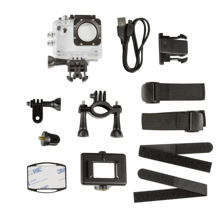 Les accessoires fournis : 1 boitier étanche, 1 support étanche, 1 attache étanche, 1 support vélo, 1 attache multifonction, 1 accroche-casque, 1 sangle, 1 chiffon de nettoyage, 1 adaptateur, 2 autocollants 3M, 1 câble USB et 1 support adaptateur