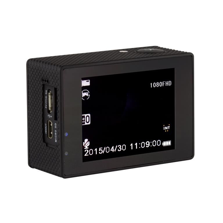 La Fiji Sportscam Full HD est équipée d’un bouton d’alimentation, d’un bouton pour choisir la fonction (Photo, vidéo, lecteur ou paramètres) et un écran HD de 2 pouces.